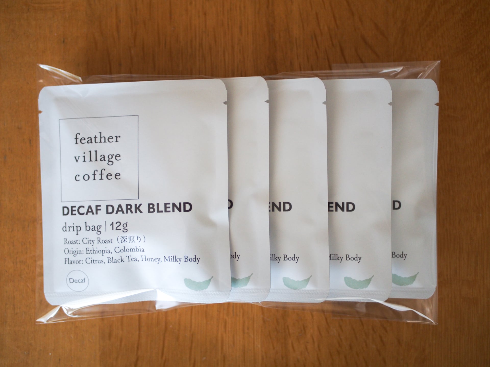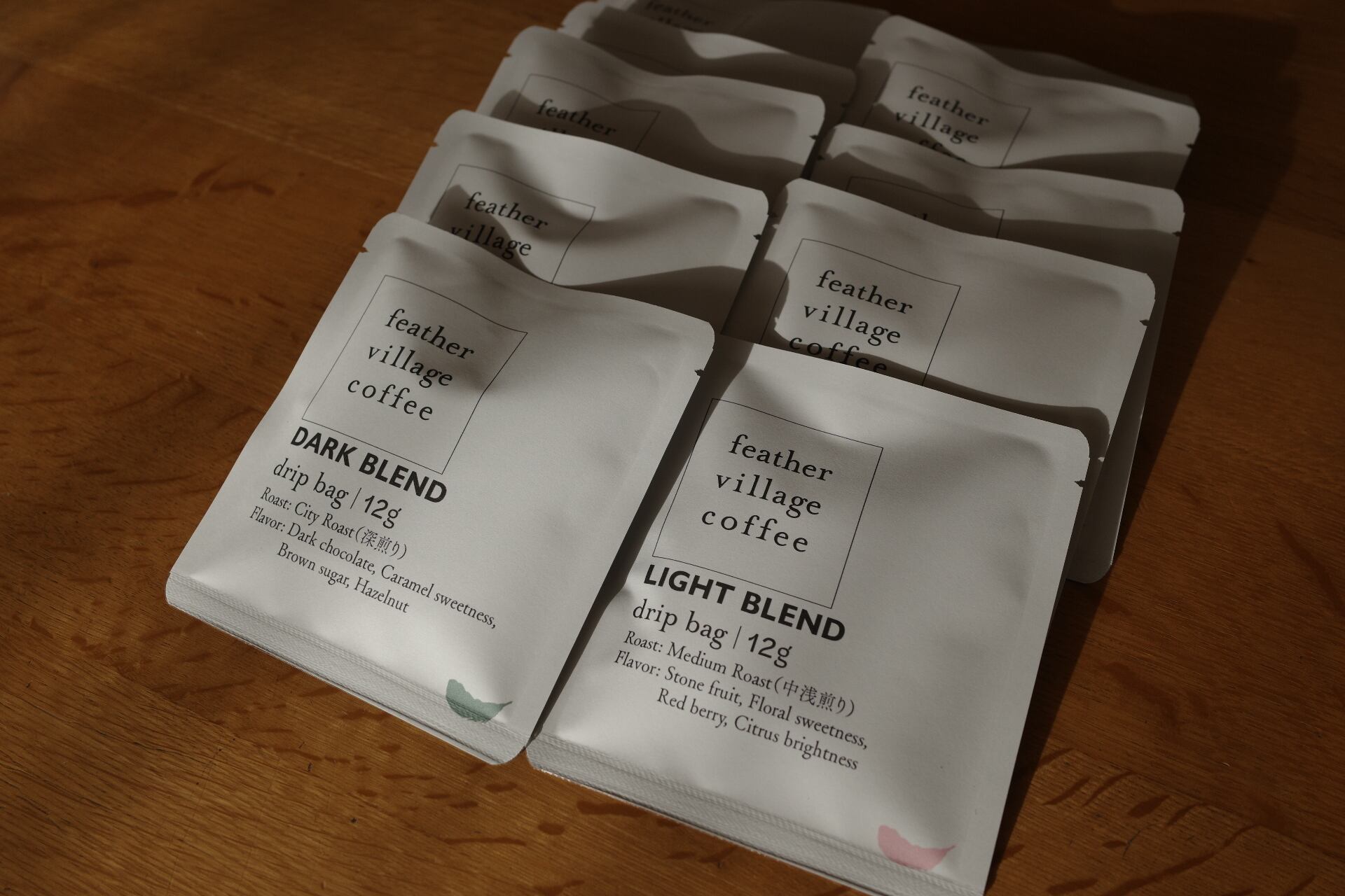 feather village coffeeではドリップバッグのラインナップとパッケージデザインを更新しました。選んでいただきやすいように、ライトブレンド(中浅煎り)とダークブレンド(深煎り)のシンプルな2種類のラインナップを基本とし、それぞれデカフェもご用意しました。